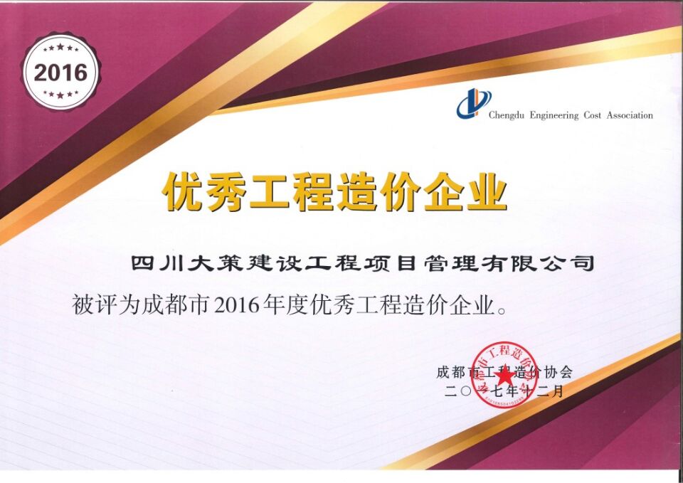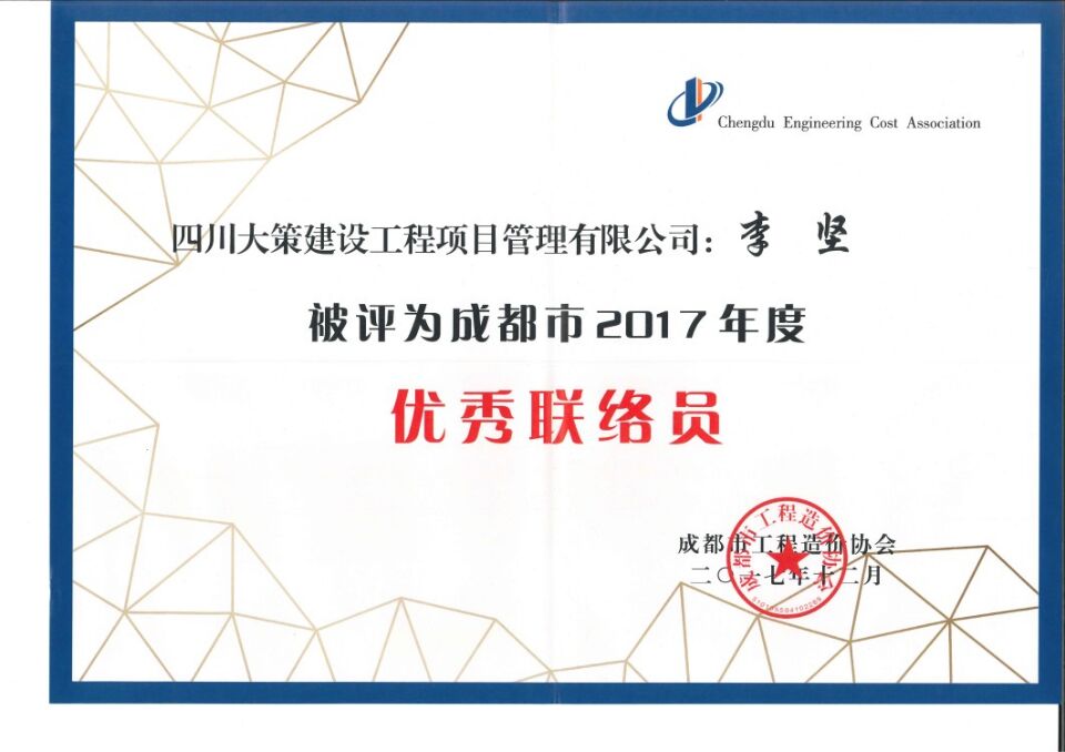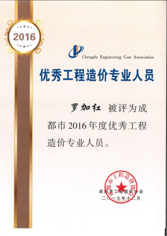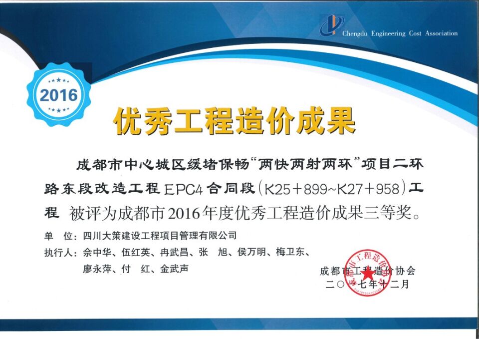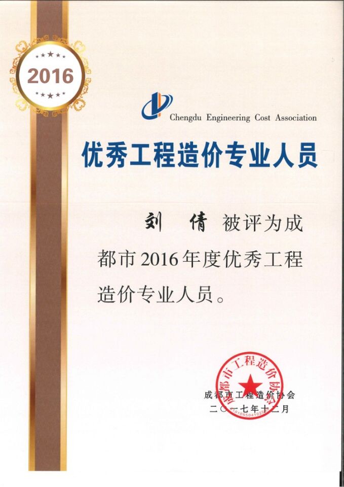 我公司獲2016年成都市優(yōu)秀造價工程咨詢企業(yè),劉倩和羅家紅獲優(yōu)秀造價人員,李堅獲優(yōu)秀聯(lián)絡(luò)員,二環(huán)路東段改造工程EPC4合同段獲成都市優(yōu)秀造價咨詢成果三等獎。獲得的這些表彰是對我們公司的極大肯定,也是對我們公司員工業(yè)務(wù)水平的極大肯定。回顧昨天,展望明天。在新的一年我們將緊緊圍繞確定的各項目標(biāo)任務(wù)做到精心謀劃、統(tǒng)籌安排、狠抓落實繼續(xù)保持穩(wěn)步、協(xié)調(diào)、積極發(fā)展的良好態(tài)勢迎接新的機(jī)遇與挑戰(zhàn)。
