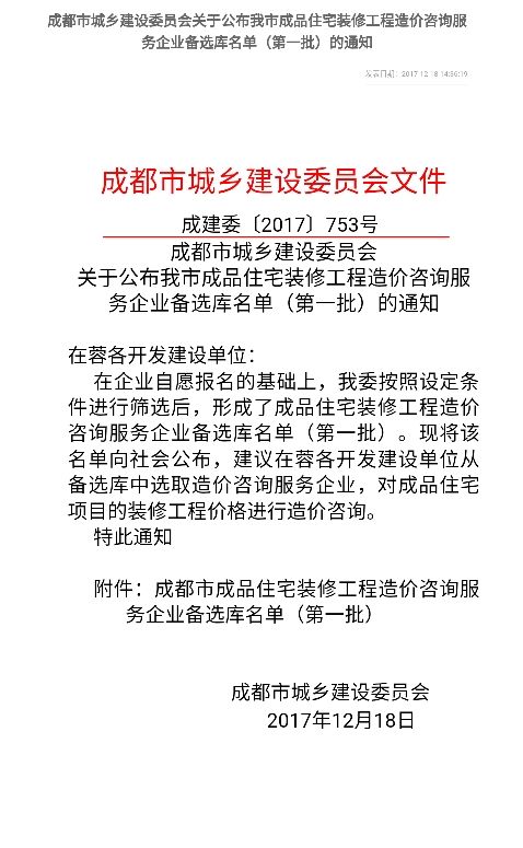 我公司入庫成都市成品住宅裝修工程造價咨詢服務(wù)企業(yè)備選庫