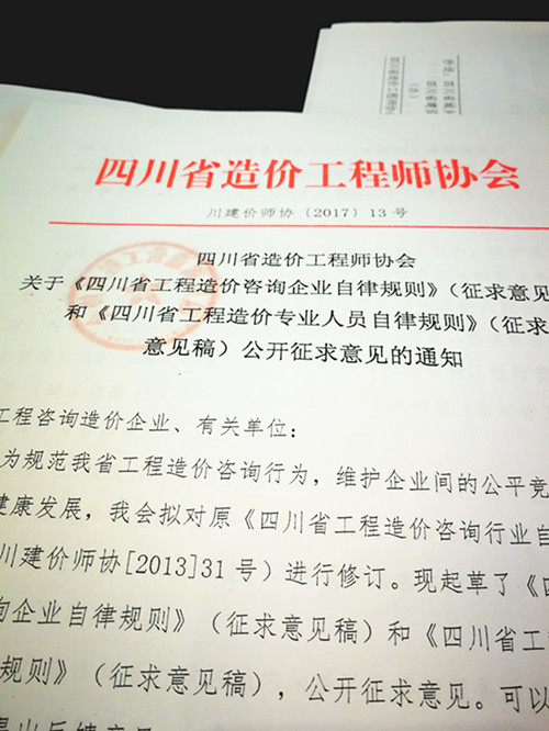 四川省造價(jià)工程師協(xié)會(huì)關(guān)于《四川省工程造價(jià)咨詢企業(yè)自律規(guī)則》(征求意見)和《四川省工程造價(jià)專業(yè)人員自律規(guī)則》(征求意見稿)公開征求意見的通知